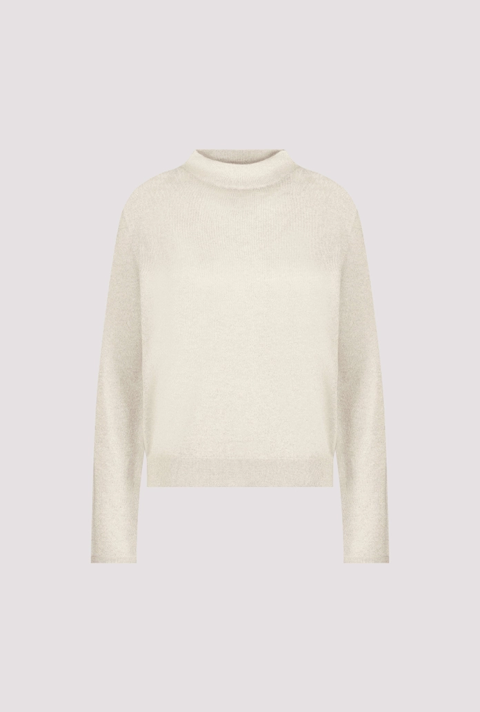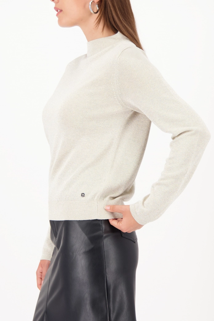 Zažite eleganciu s týmto svetrom vyrobeným z vysoko kvalitnej bavlnenej zmesi a lesklého lurexu, ktorý sa vyznačuje splývavými záhybmi pre moderný vzhľad.