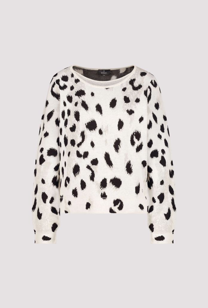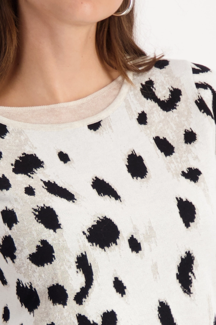 Elegantný pletený sveter vyrobený z vysoko kvalitnej bavlny s dvojitým okrúhlym výstrihom a modernou leopardou potlačou.