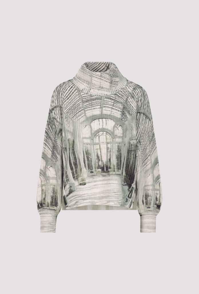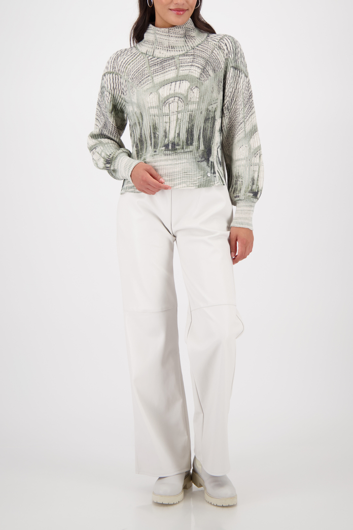 Elegantný pletený sveter vyrobený z vysoko kvalitnej bavlny s bočnými rozparkmi a výraznou galériovou potlačou pre štýlové pohodlie.