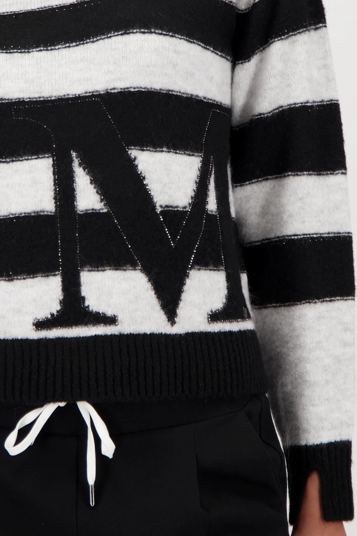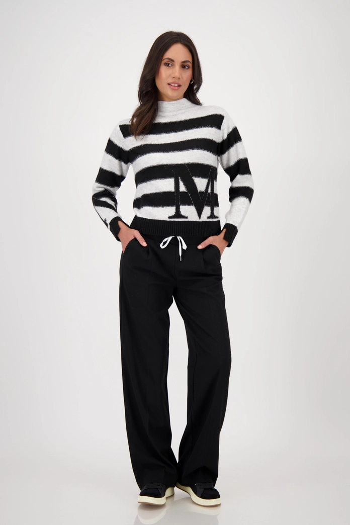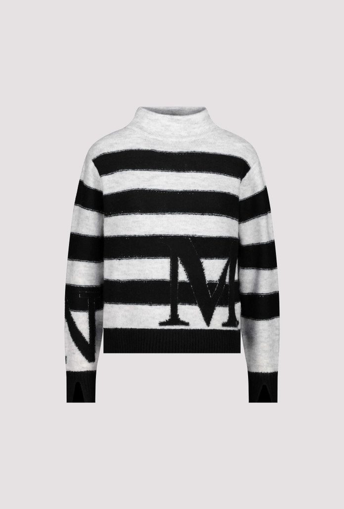 Elegantný sveter zo splývavej viskózy s pruhovaným vzorom, zdobený kamienkami, stojačikom a intarzívnym vzorom – to je nevyhnutnosť!