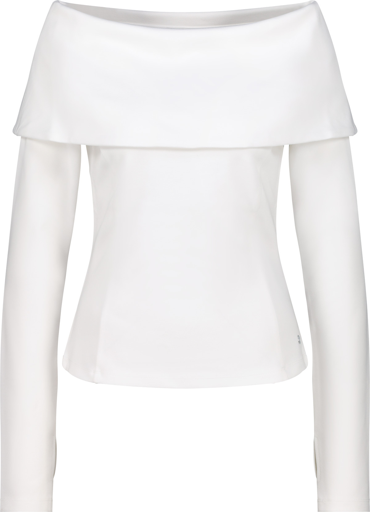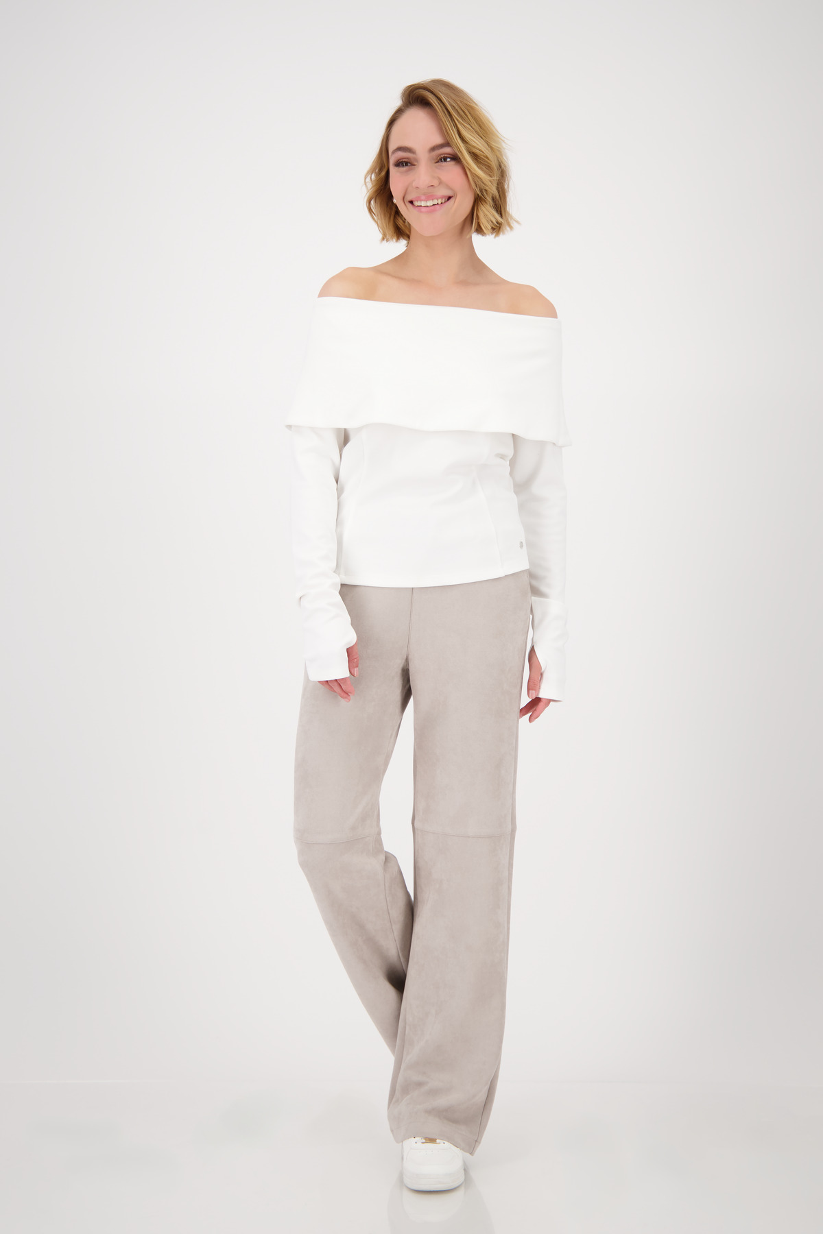 Top vyrobený zo splývavej viskózy a elastického materiálu je mierne priliehavá a má prehnutý karmínový výstrih.