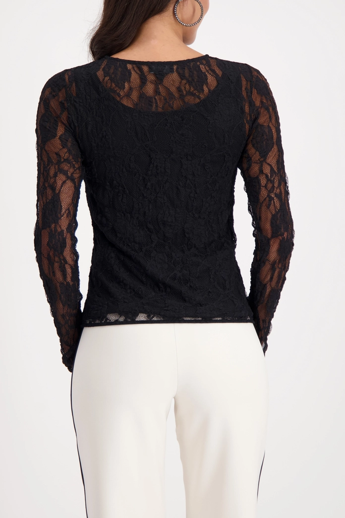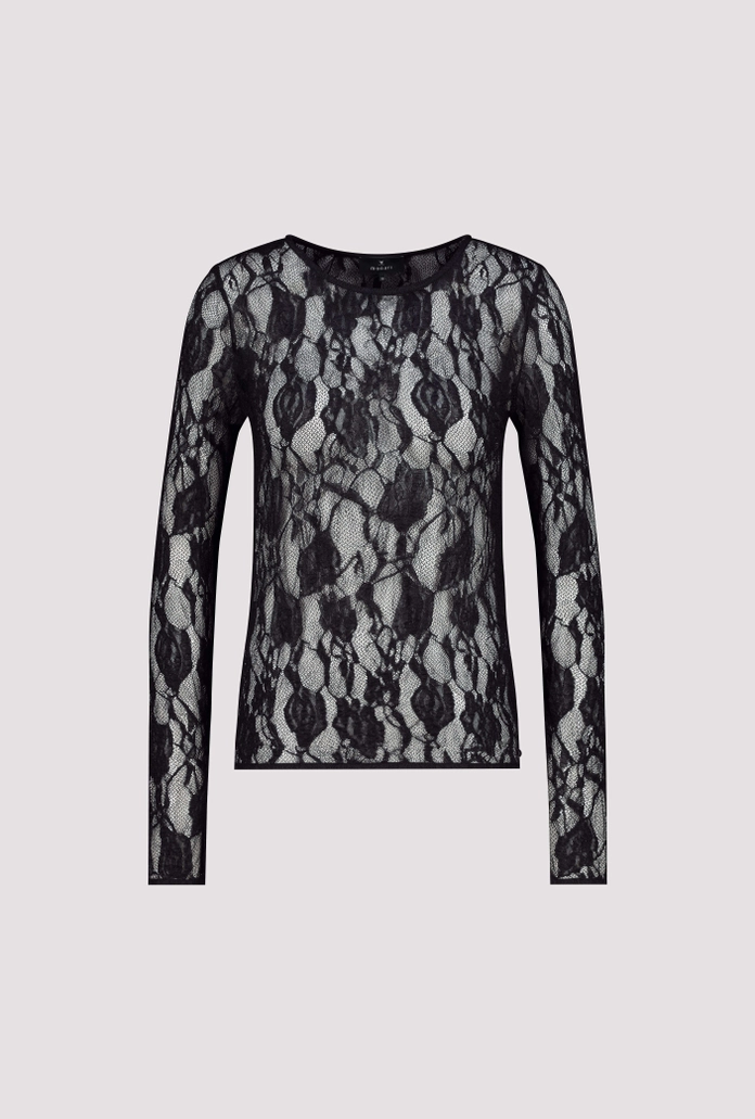 Táto priehľadná košeľa s dlhým rukávom z elastickej kvetinovej čipky jemne obopína siluetu a dodáva každému outfitu ženský nádych.