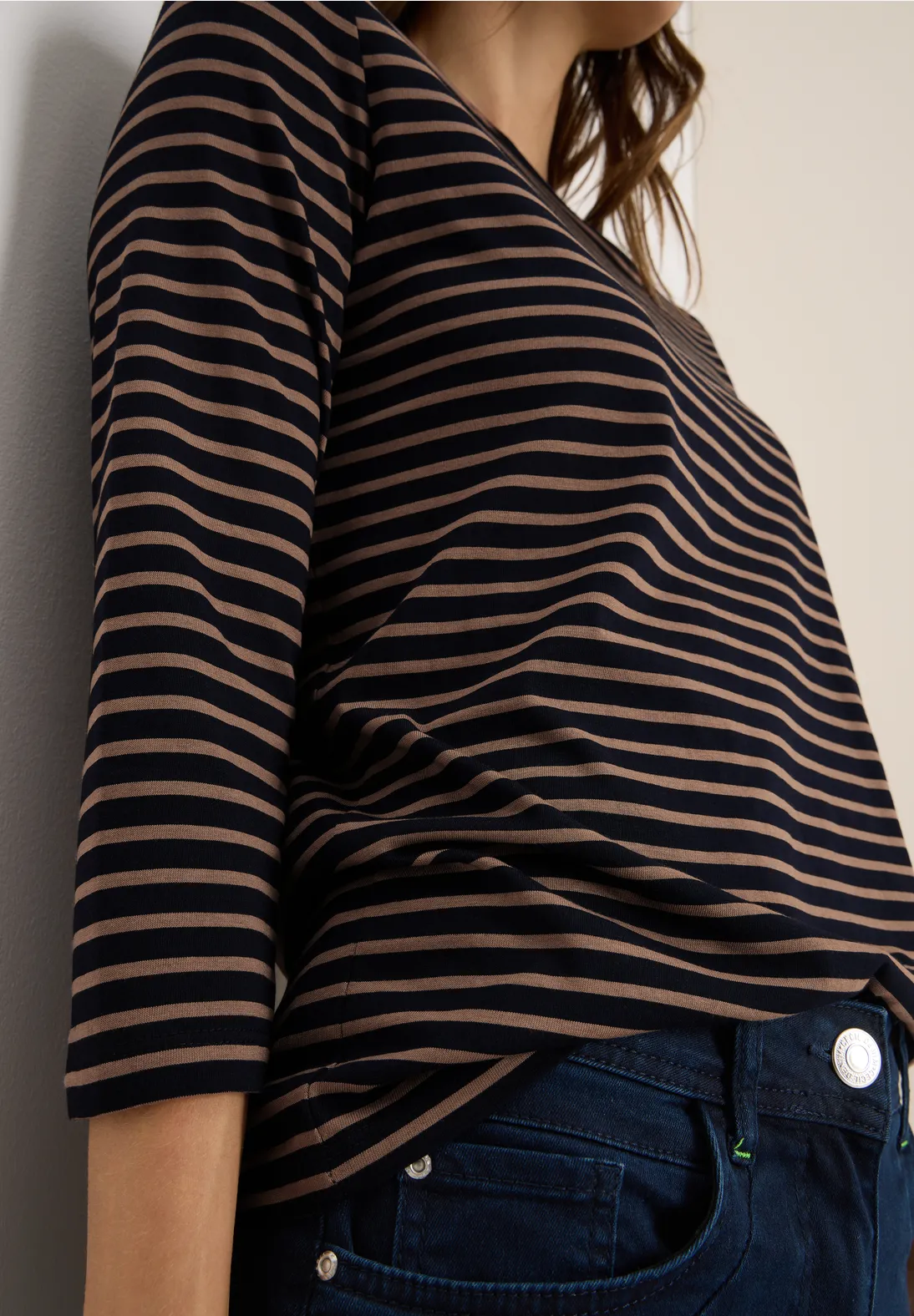 Táto pruhovaná košeľa od značky CECIL pre ženy dodá vášmu každodennému vzhľadu svieži nádych vďaka lodičkovému výstrihu a 3/4 rukávom.