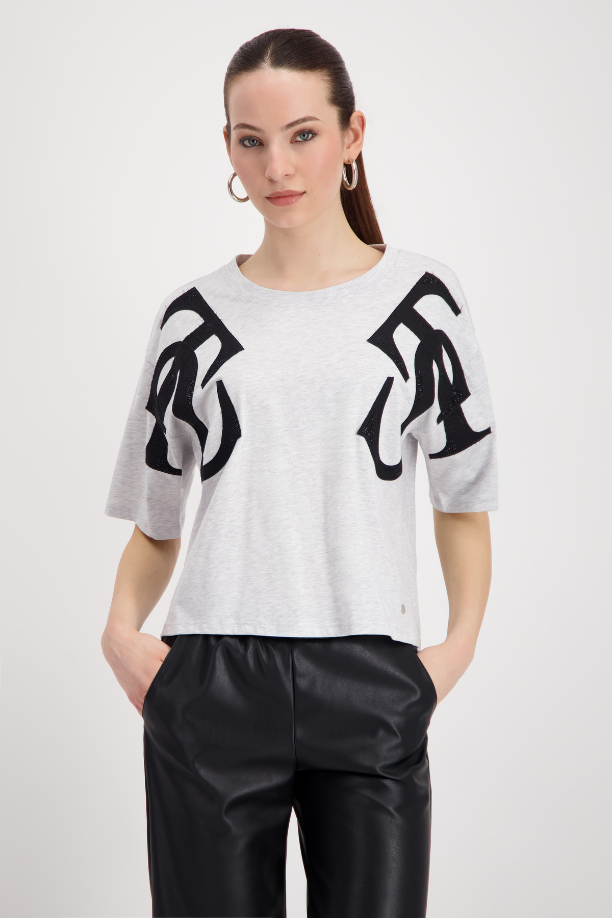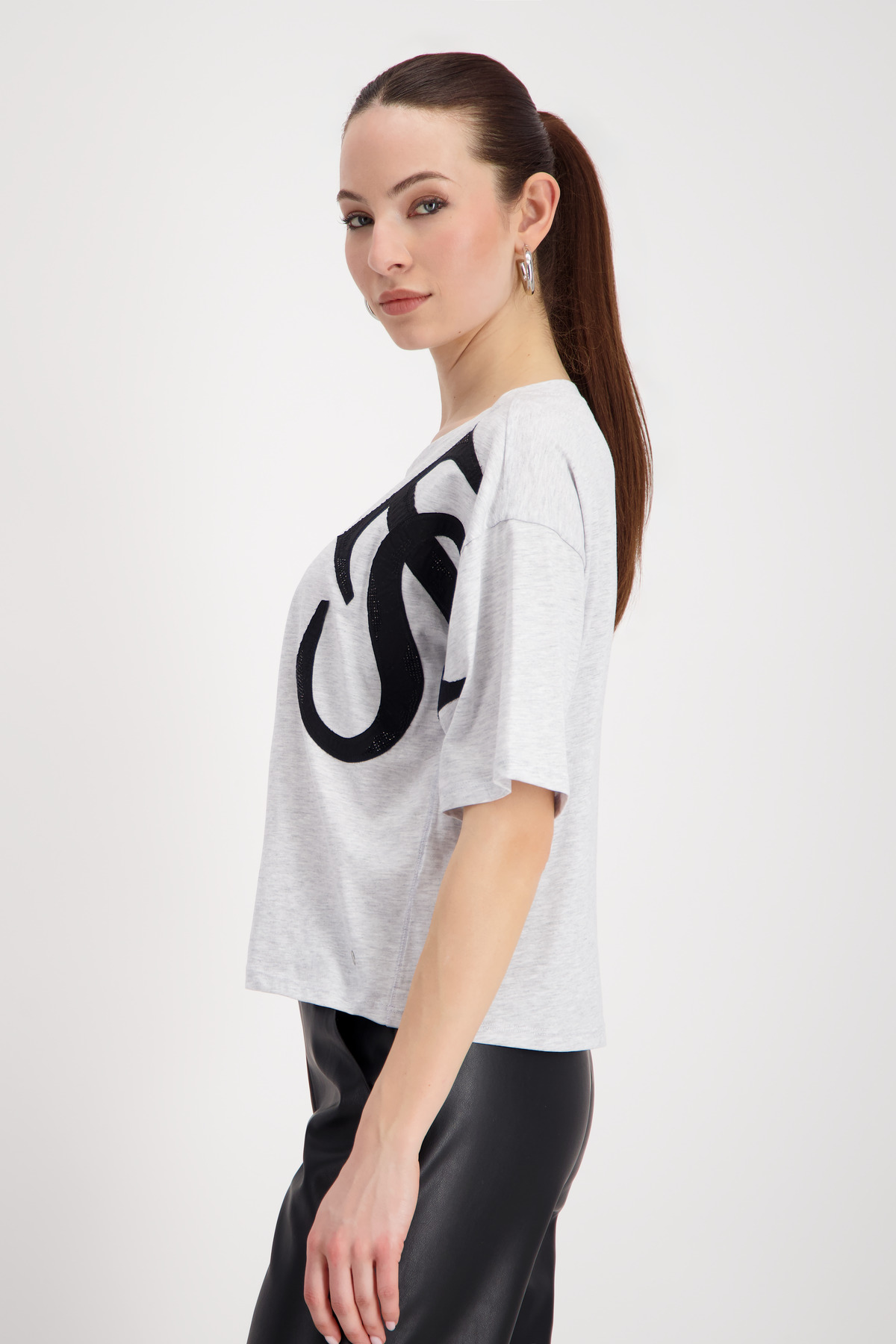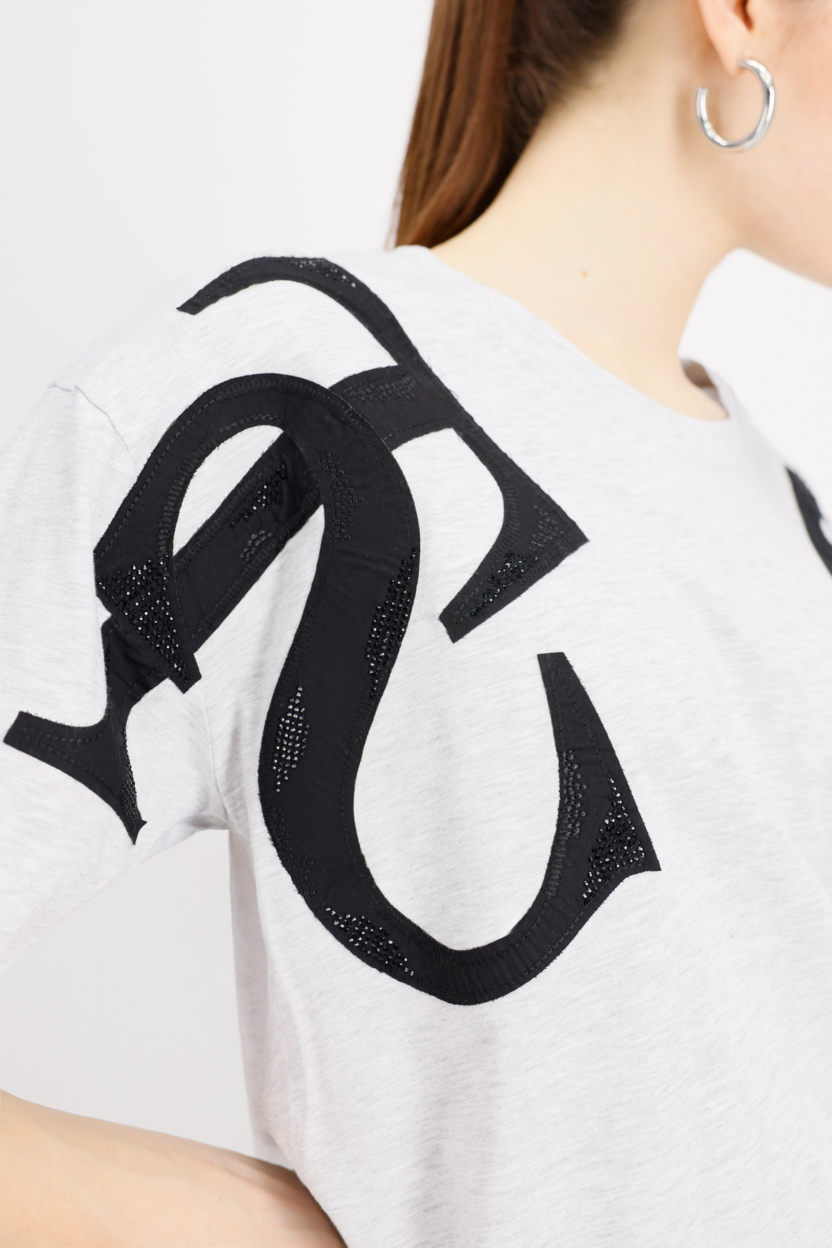 Štýlové tričko vyrobené z vysoko kvalitnej bavlnenej zmesi, zdobené kamienkovými písmenami a ležérne, mierne spustenými ramenami.