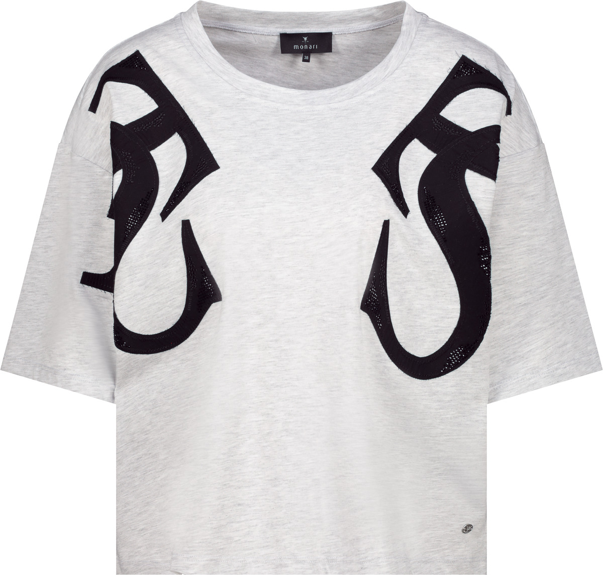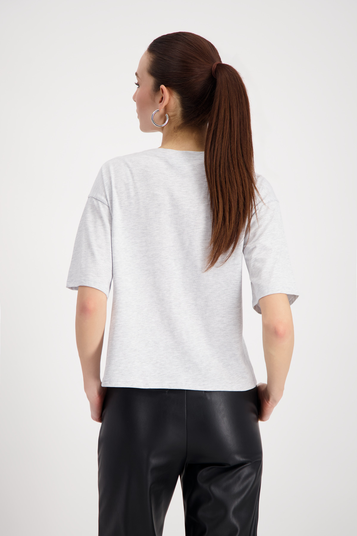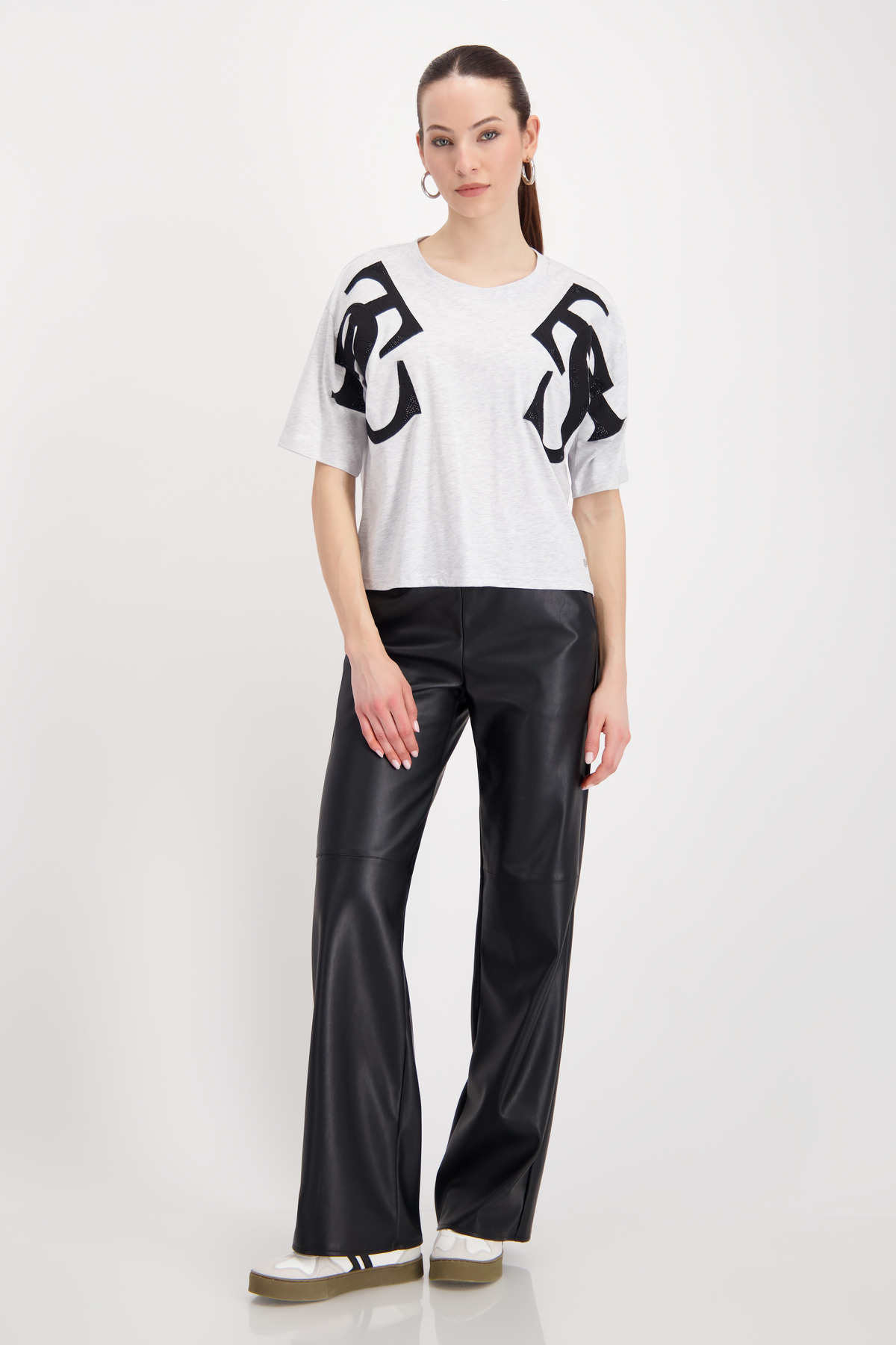 Štýlové tričko vyrobené z vysoko kvalitnej bavlnenej zmesi, zdobené kamienkovými písmenami a ležérne, mierne spustenými ramenami.