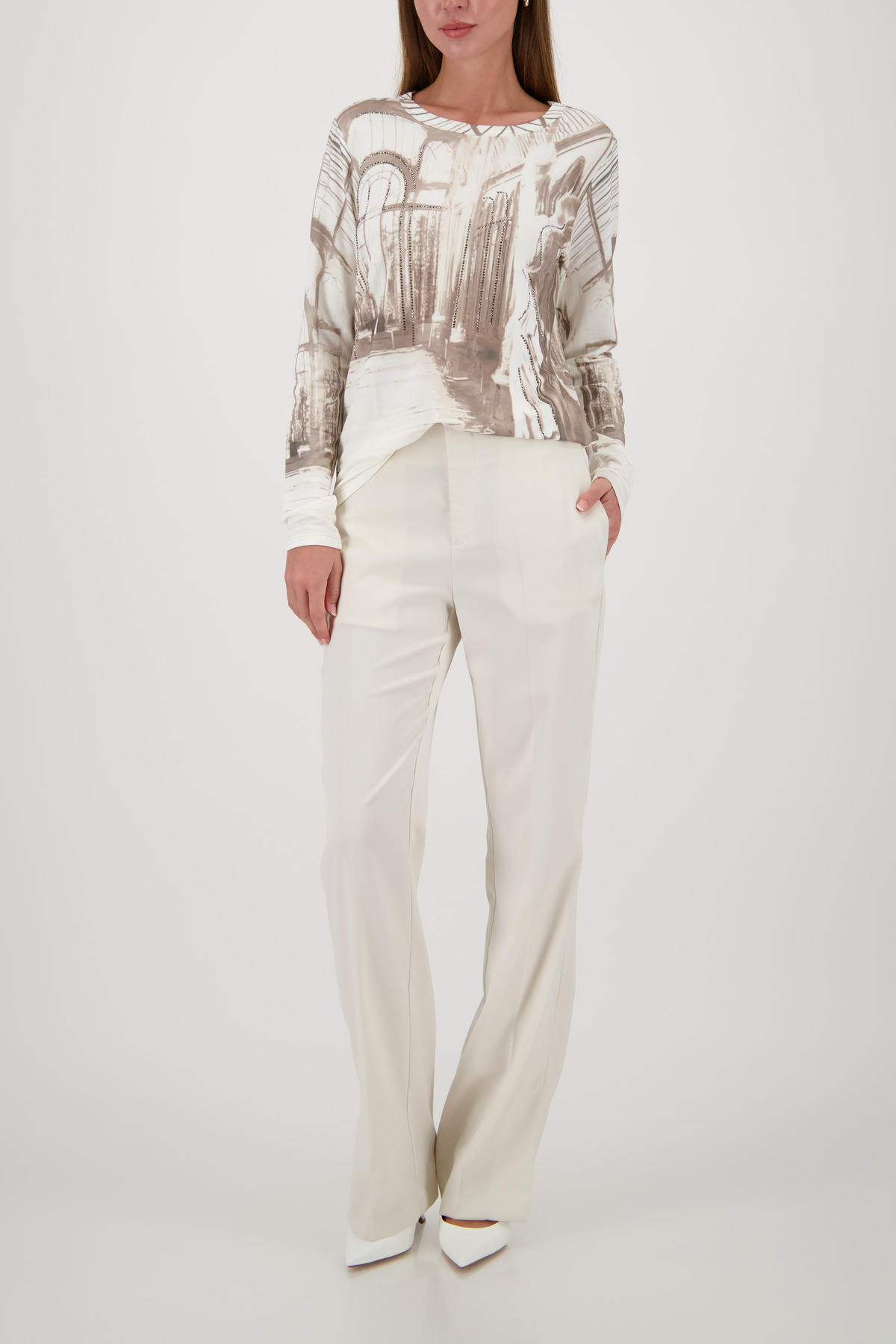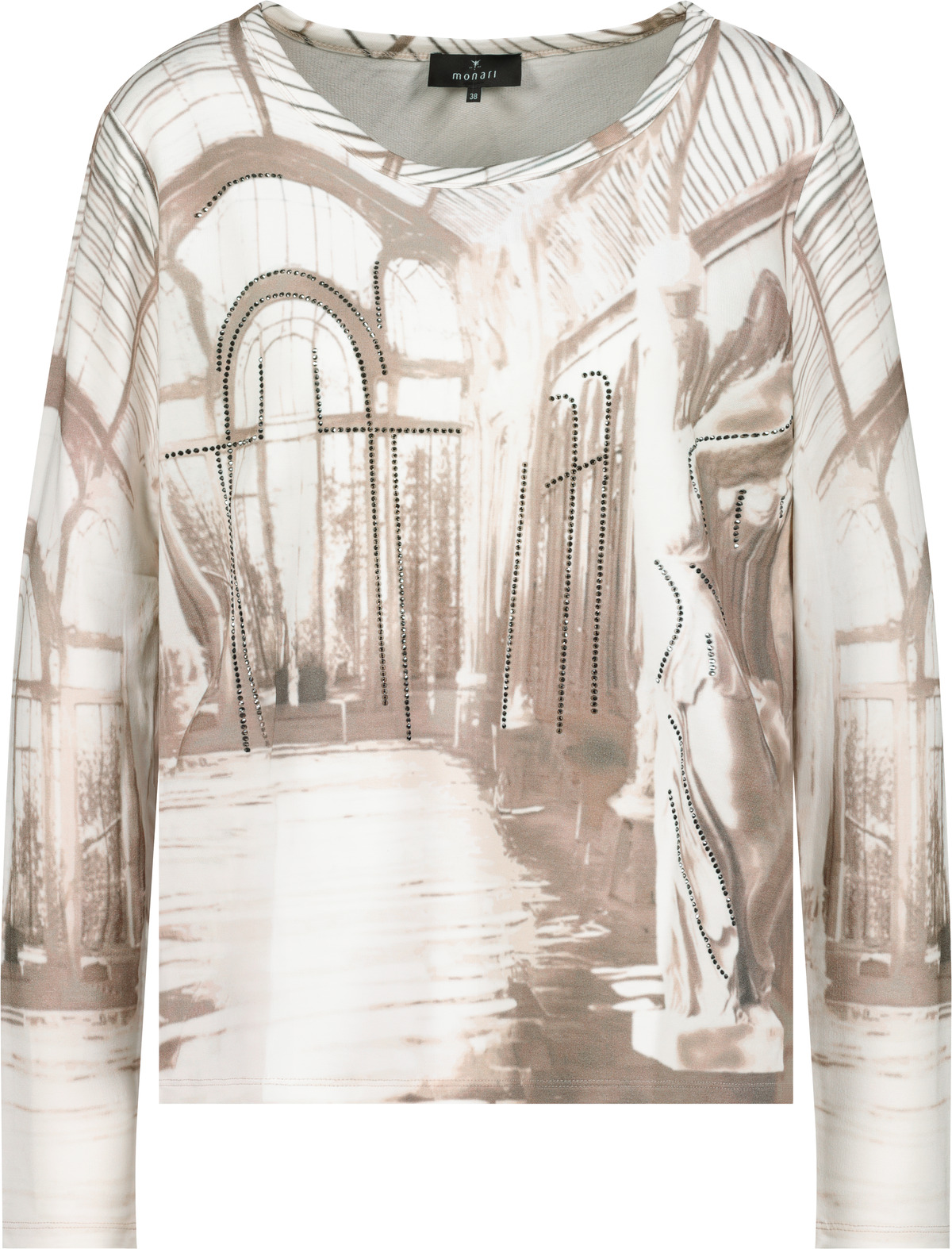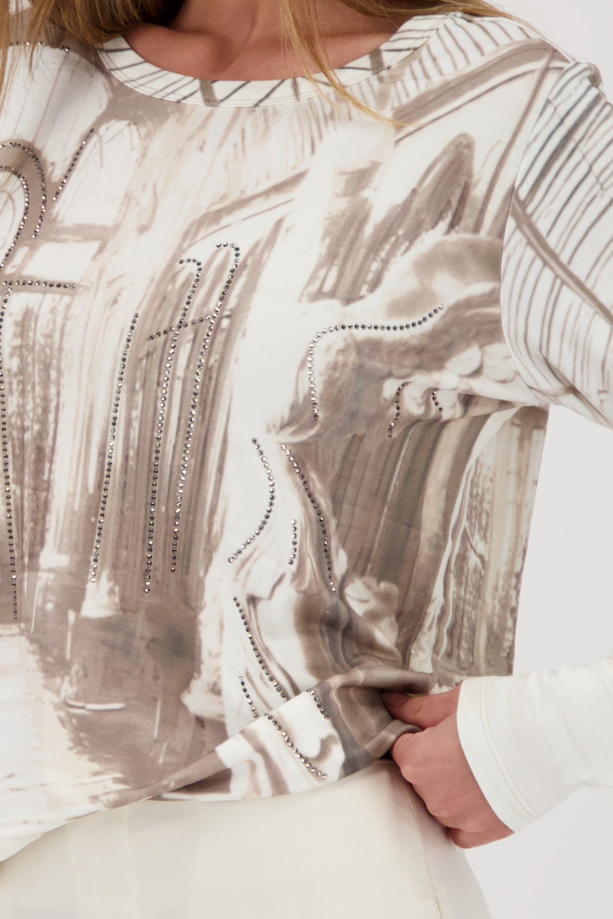 Elegantná košeľa s dlhým rukávom vyrobená zo splývavej viskózy, zdobená kamienkami a umeleckou galériovou potlačou pre ženy, ktoré dbajú na štýl.