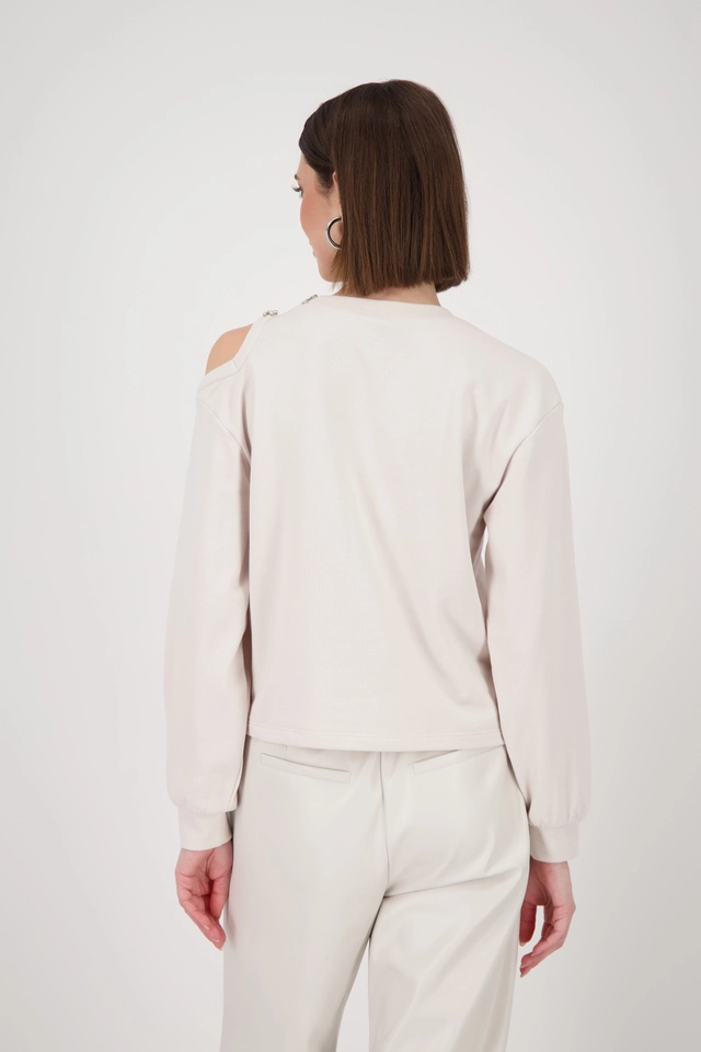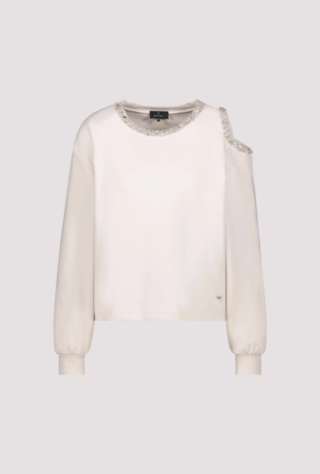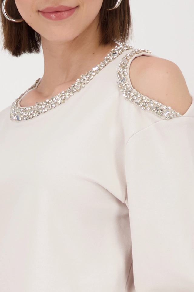 Táto mikina vyrobená z vysoko kvalitnej bavlnenej zmesi má výstrih na jednom ramene, trblietavé kamienky na výstrihu a ramenách a mierne spadnuté ramená.