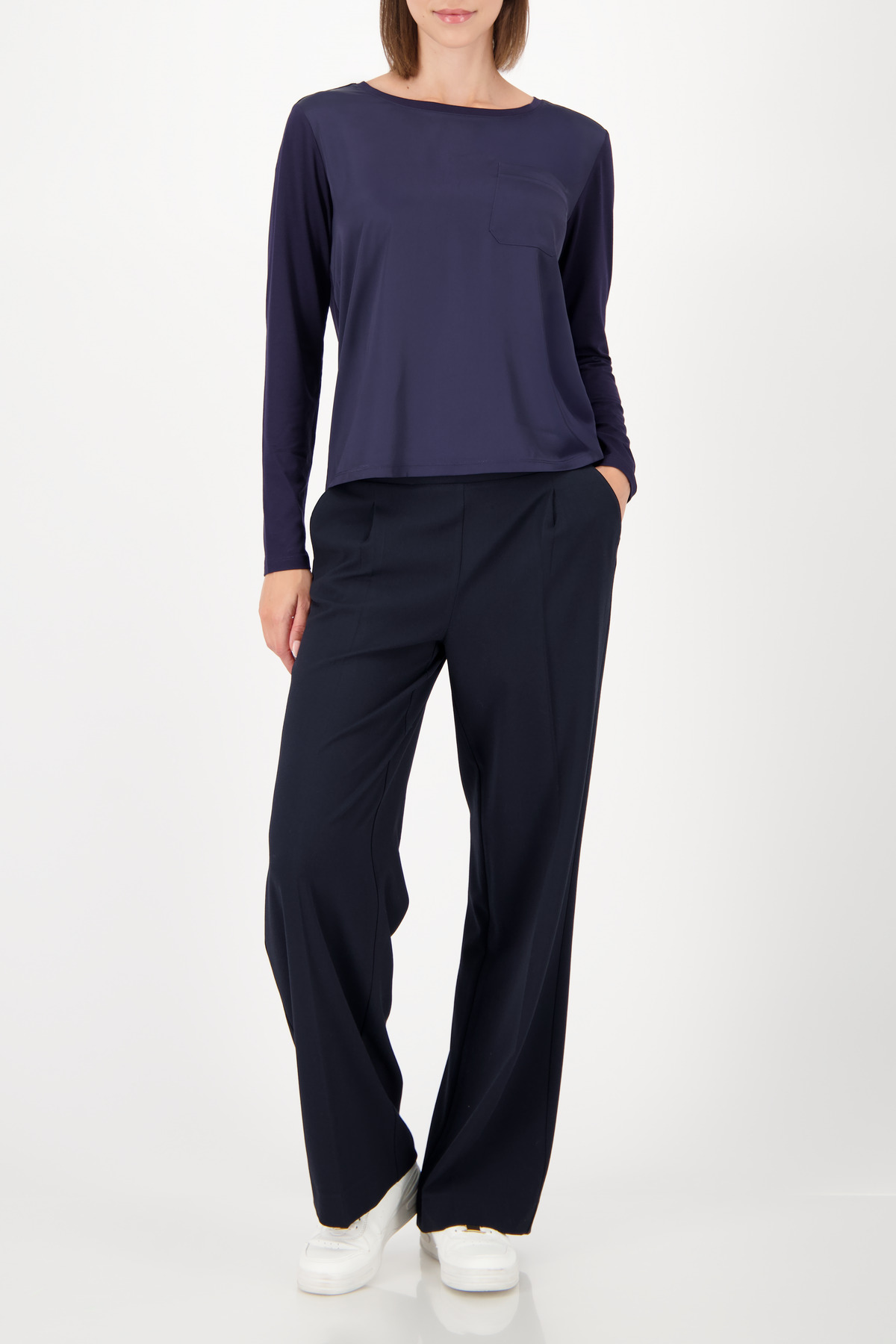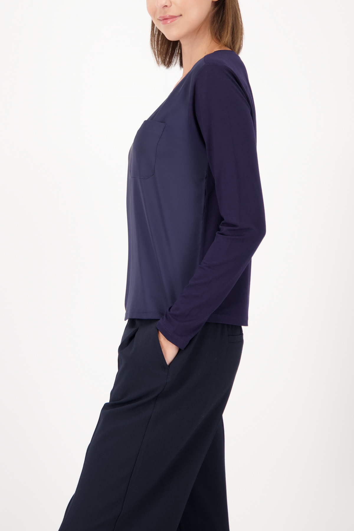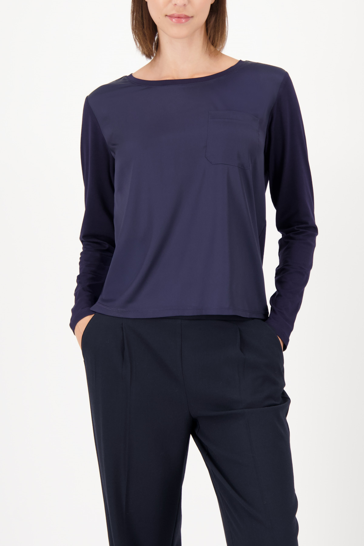 Blúzka vyrobená zo splývavej viskózy so saténovým predným dielom, s našitým náprsným vreckom a klasickým strihom – ideálna pre štýlový každodenný outfit s pohodlným a elegantným pocitom