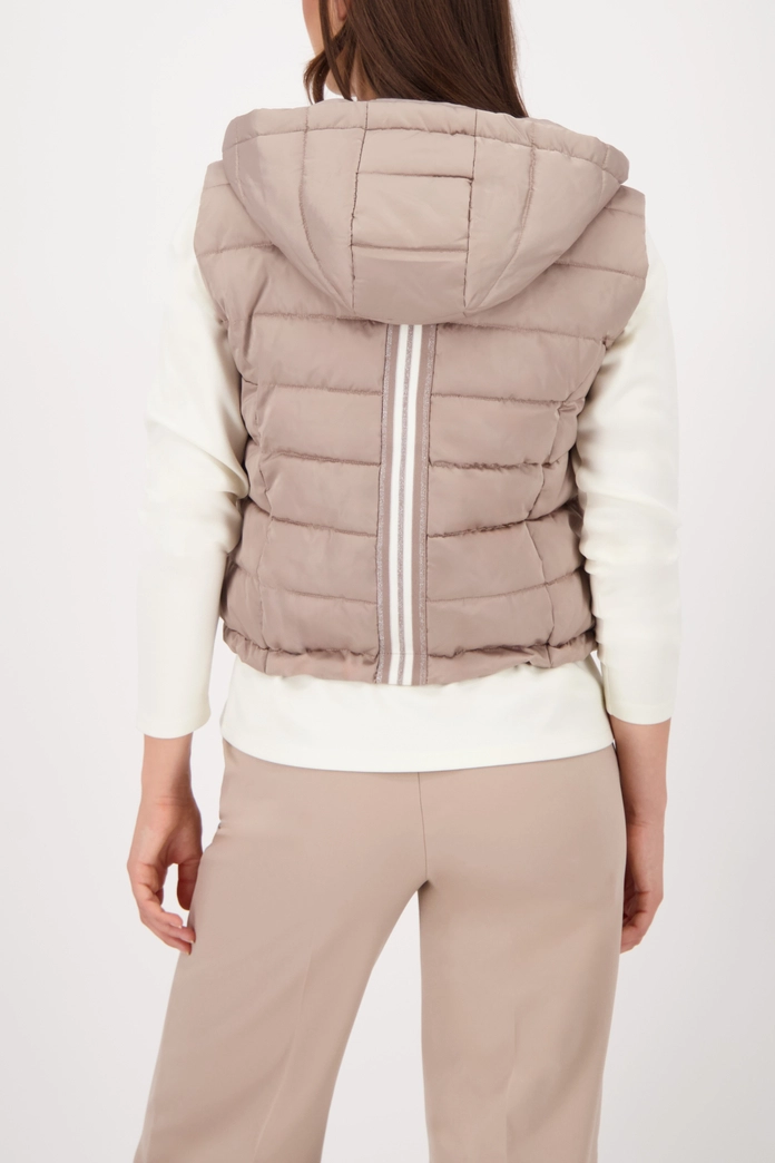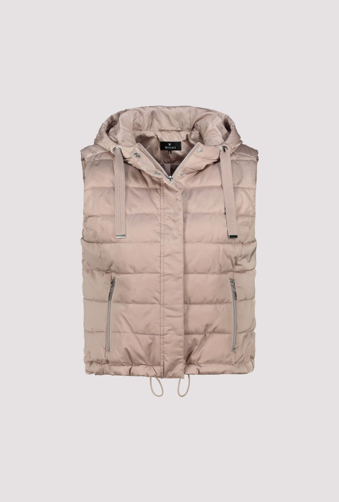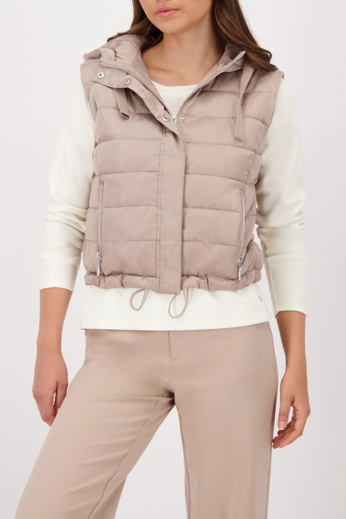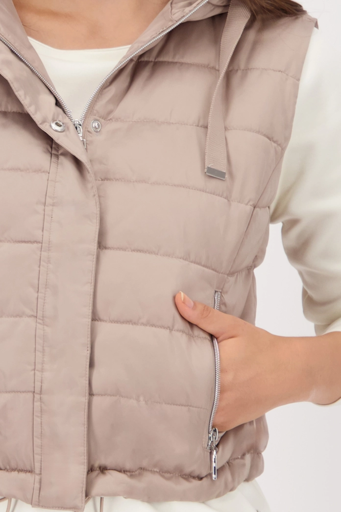 Táto prešívaná vesta kombinuje moderný štýl s funkčnosťou: kapucňa, vrecká na zips a elastický pás pre dokonalé pohodlie.