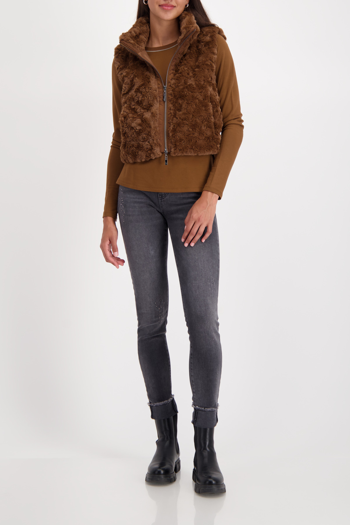 Mäkká a módna vesta z umelej kožušiny zaujme stojačikom a bočnými vreckami.