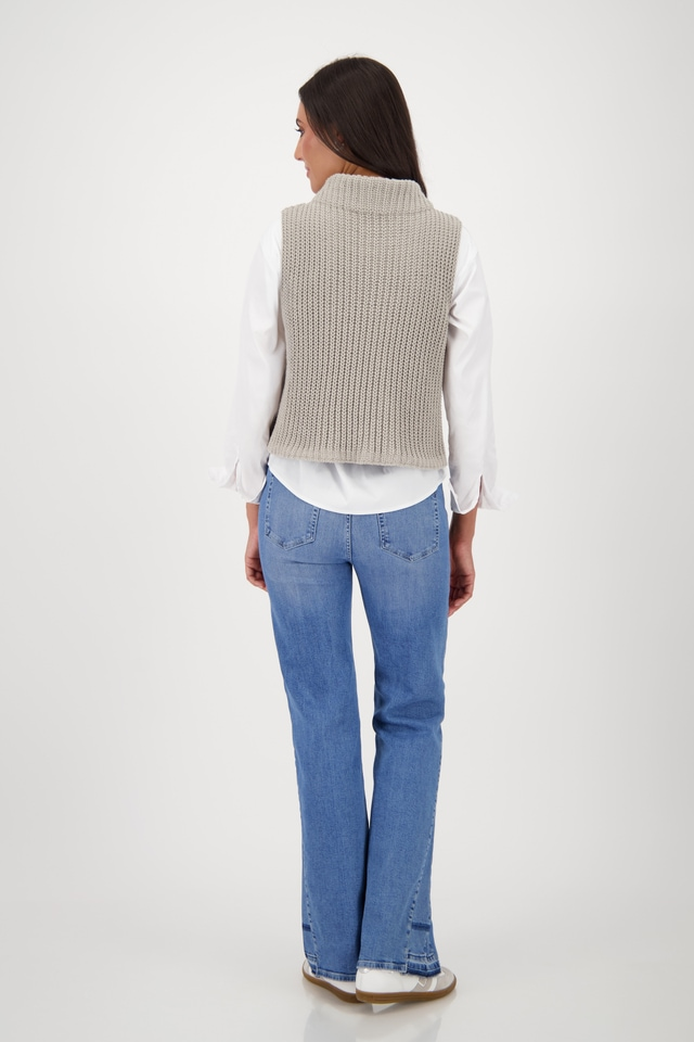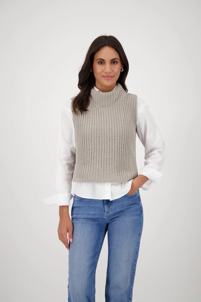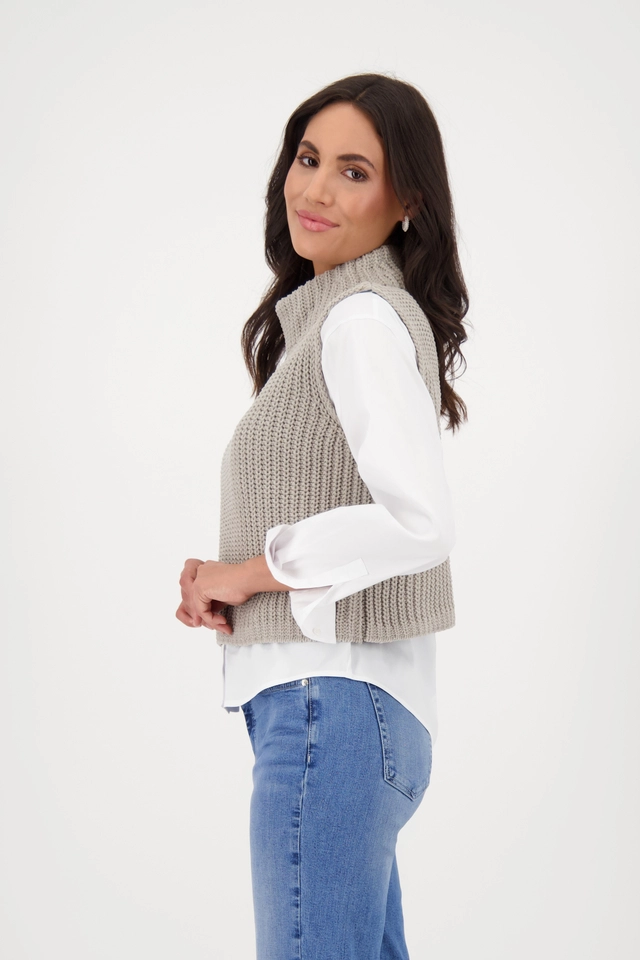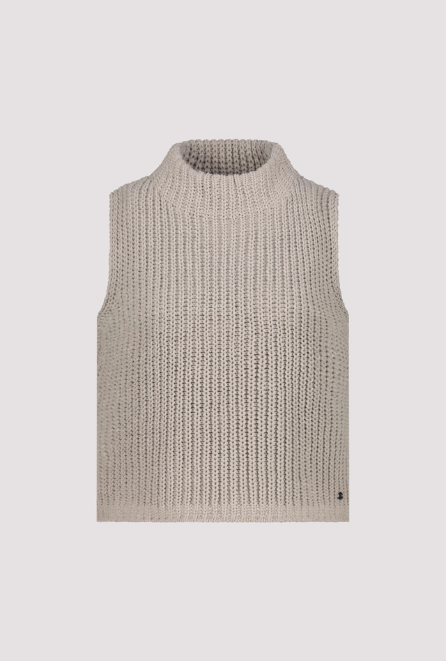 Pletená vesta bez rukávov s mäkkým pocitom a klasickým strihom. Stojáček vytvára elegantný vzhľad – ideálny pre všestranné a štýlové kombinácie