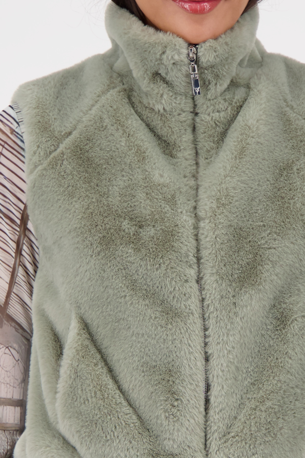 Luxusná vesta z umelej kožušiny s nadýchanou textúrou, stojačikom, bočnými vreckami a praktickým obojsmerným zipsom.